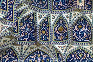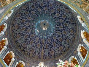 ويقع فوق القبر مباشرة، قبة يبلغ ارتفاعها عن سطح الأرض 20 مترا وقطرها 10 مترا وتم إكسائها من الخارج بصفائح نحاسية مطلية بالذهب. وامّا من الداخل كسيت جدرانها بالقاشاني المزخرف. وعلى جانبي القبة تقوم مئذنتان ارتفاع كل منهما 50 متراً وقطرها 2.5 متر، تم إكسائها من الأعلى بالقيشاني المعرق تتخلله أسماء الله الحسنى.