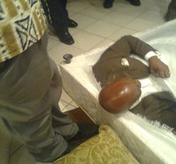 وزير العدل السوازي يحاول الاختباء في الفراش عند ضبطه مع زوجة الملك الثانية عشر في أحد فنادق العاصمة مبابانه، أغسطس، 2010.