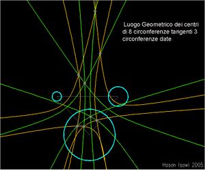 مشكلة أبولونيوس الشهيرة ": أعطيت ثلاث دوائر ، ربما متدهورة ، يُطلب ايجاد جميع الدوائر الماسة الدوائر المعطية. الدوائر المتدهورة تعني تلك التي نصف قطرها صفر (نقطة) او لانهائي (خط المستقيم).