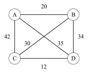 يريد تاجر أن يقوم بجولة كاملة يزور خلالها مدنا حيث يمر بكل المدن مرة واحدة و وحيدة ثم يعود إلى مدينة الانطلاق. المشكلة هي ما هو أقصر طريق؟؟