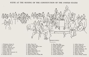 مشهد من توقيع دستور الولايات المتحدة Scene at the Signing of the Constitution of the United States هي لوحة زيت على كانڤا، سنة 1940، بريشة هاورد تشاندلر كريستي، تصوّر المؤتمر الدستوري يوقـِّع الدستور الأمريكي في Independence Hall في فيلادلفيا في 17 سبتمبر 1787. Along with Washington Crossing the Delaware by Emanuel Leutze, the painting is one of the most famous depictions of the early days of the United States. Christy created the painting in April 1940; it is so large (20 × 30') that he painted it in a sail loft. It currently is displayed along the east stairway in the House of Representatives wing in the Capitol building.