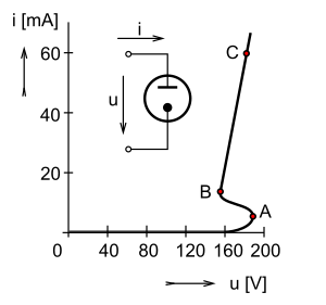كما في الشكل البياني: بمجرد حدوث الضوء تقل المقاومة الكهربائية للمصباح وهذا يبدو من منحنى الخواص الكهربية للأنبوب. إذ بزيادة سريان التيار في الغاز يزداد عدد الأيونات المولدة وهذه تساعد على سريان التار، هذا هو الحال بين النقطتين B , A على المنحنى حيث يتراجع الجهد U بعض الشيء. ولهذا فيجب أن تحتوي الدائرة الخارجية عل مقاومة مثلاً للحد من استمرار التيار في الارتفاع داخل الأنبوب ويحترق المصباح. وفعلا بالنسبة لمصابيح النيون الصغيرة التي تستخدم كعلامة صغيرة لمرور تيار (مثلاً في المكواة) فهي مزودة بمقاومة كهربائية خارجية للحد من التيار. وأما علامات النيون ذات الأنابيب الطويلة فهذه تزود بمحول كهربائي خصيصاً لتقليل التيار على الملف الثانوي.