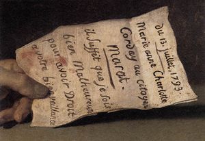حين قتلت شارلوت كورداي جان-پول مارا (13 يوليو 1793) صوَّر جاك-لوي دافيد الميت راقداً في حمامه نصف مغمور في الماء، وندر أن كان التصوير ممعناً في تصويره للواقع إلى هذا الحد، أو في تعمده إثارة المشاعر. وقد أرست اللوحتان سجل شهداء الثورة.