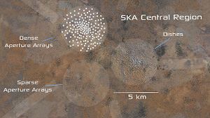 1. منطقة مركزية تحتوي على مساحة تشمل أطباق مساحتها 5 كيلومترات من الهوائيات ، ومحطات SKA متوسطة والهوائيات SKA المنخفضة. وهذه المنطقة الوسطى تحتوي على ما يقرب من نصف المساحة الإجمالية لجميع مصفوفات SKA الثلاثة.