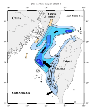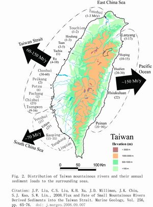10. ^ أ ب Liu, J. P.; Liu, C. S.; Xu, K. H.; Milliman, J. D.; Chiu, J. K.; Kao, S. J.; Lin, S. W. (20 December 2008). "Flux and fate of small mountainous rivers derived sediments into the Taiwan Strait". Marine Geology (in الإنجليزية). 256 (1): 65–76. Bibcode:2008MGeol.256...65L. doi:10.1016/j.margeo.2008.09.007. ISSN 0025-3227.