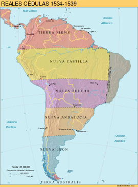 في ع. 1530، قام شارل الخامس بتقسيم أمريكا الجنوبية وما يقع جنوبها إلى سلسلة من المنح لمختلف الكونكيستادور (الفاتحين). وذهب مضيق ماجلان والمنطقة الواقعة جنوبه إلى پدرو سانتشيز دى لا هوز.[19][ب] في عامي 1530 و1531، امتلك آل فوگر حقوق التجارة عبر مضيق ماجلان. ورغم الاعتقاد بإمكانية التجارة الأوروپية مع آسيا عبر هذا الطريق، إلا أن آل فوگر لم يُطوروا هذا الطريق قط.[20]