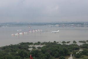 In December 2015, unprecedented rainfall associated with India's Northeast monsoon caused extensive flooding of the airport tarmac and runways. As part of the airport is situated on the floodplains of the Adyar river, extensive waterlogging occurred in the airport.[38] The airport was closed for a week to all traffic from 1 to 6 December. About 1,500 passengers and 2,000 airport workers were evacuated as water entered terminal buildings and 30–35 aircraft were stranded on the apron.[39] Military authorities permitted the use of Naval Air Station INS Rajali in Arakkonam, 70 km (43 mi) west of central Chennai and Tambaram Air Force Station 20 km (12 mi) south as relief airports for a limited service of civilian commercial flights as well as official rescue/assistance flights.[40] The Indian Air Force evacuated passengers from Chennai airport to the two military bases for onward journeys on Air Force transport aircraft to other domestic destinations.[41] On 5 December, the Directorate General of Civil Aviation permitted a partial re-opening of the airport during daylight hours under visual meteorological conditions only, allowing airlines to ferry stranded aircraft without passengers or cargo on board. Operations under instrument meteorological conditions were not permitted and rescue and assistance flights, were permitted to operate in and out of the airport from 6 December.[42]