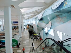 Inside the terminal hangs Flight, a mural measuring 12 ft (3.7 m) in height and 237 ft (72 m) in length; it was the largest mural created as part of the Great Depression–era Works Progress Administration (WPA).[108] Completed by James Brooks in 1942, Flight depicts the history of humanity's involvement with flight. The mural was painted over without explanation by the Port Authority of New York and New Jersey in the 1950s, possibly because some saw left-wing symbolism in it.[109] After an extensive restoration project headed by aviation historian Geoffrey Arend, the mural was rededicated in 1980.[110]