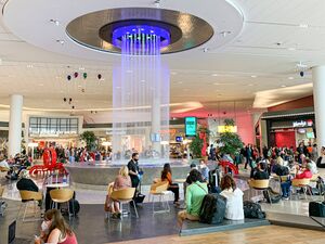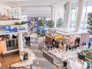 LaGuardia Gateway Partners, which manages the construction of Terminal B, has completed most of the complex.[78] The first half of the seven-level West Parking Garage opened in February 2018, with 1,600 of 3,100 parking spaces being made available, and the rest of the garage was opened later that year.[79][66] Eleven new gates at Terminal B opened on December 1, 2018, and were used by Air Canada, American Airlines, and Southwest Airlines. Five additional gates opened on June 2, 2019, when United relocated most of its operations to the new concourse.[80][81][82] The new space included a concourse with a 55 ft-tall (17 m) ceiling, food concessions, an FAO Schwarz toy store, and an indoor play area.[82] The new headhouse at Terminal B opened on June 13, 2020, along with the new connector to the Eastern Concourse. On August 5, 2020, American opened the first seven gates of the Western Concourse, with ten additional gates and the bridge connector scheduled to open at the end of 2021.[83][84] The second bridge connecting to Terminal B was later completed and opened to the public on January 27, 2022.[85]