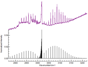 ![]() Part of the spectrum of the asymmetric H-C-H bending vibration in CH3Cl (perpendicular band), simulated with Spectralcalc[6] |
