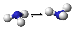 For ammonia, NH3, the symmetric bending vibration is observed as two branches near 930 cm−1 and 965 cm−1. This so-called inversion doubling arises because the symmetric bending vibration is actually a large-amplitude motion known as inversion, in which the nitrogen atom passes through the plane of the three hydrogen atoms, similar to the inversion of an umbrella. The potential energy curve for such a vibration has a double minimum for the two pyramidal geometries, so that the vibrational energy levels occur in pairs which correspond to combinations of the vibrational states in the two potential minima. The two v = 1 states combine to form a symmetric state (1+) at 932.5 cm−1 above the ground (0+) state and an antisymmetric state (1−) at 968.3 cm−1.[35]