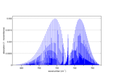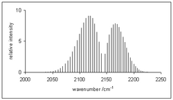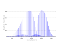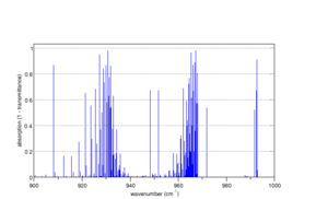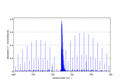 ![]() Spectrum of the asymmetric stretching (parallel) band of carbon dioxide, 12C16O2 simulated with Spectralcalc.[6] The weak superimposed spectrum is due to absorption of the first vibrationally excited level (0 11 0), which due to its low energy is populated at room temperature |