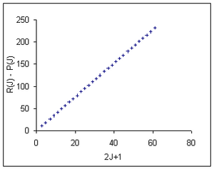 Numerical analysis of ro-vibrational spectral data would appear to be complicated by the fact that the wavenumber for each transition depends on two rotational constants, and . However combinations which depend on only one rotational constant are found by subtracting wavenumbers of pairs of lines (one in the P-branch and one in the R-branch) which have either the same lower level or the same upper level.[2][3] For example, in a diatomic molecule the line denoted P(J + 1) is due to the transition (v = 0, J + 1) → (v = 1, J) (meaning a transition from the state with vibrational quantum number ν going from 0 to 1 and the rotational quantum number going from some value J + 1 to J, with J > 0), and the line R(J − 1) is due to the transition (v = 0, J − 1) → (v = 1, J). The difference between the two wavenumbers corresponds to the energy difference between the (J + 1) and (J − 1) levels of the lower vibrational state and is denoted by since it is the difference between levels differing by two units of J. If centrifugal distortion is included, it is given by[4]