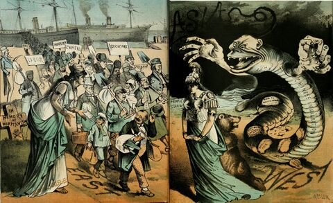 Violence against Chinese in California, Oregon, Washington, and throughout the country took many forms, including pogroms; expulsions, including the destruction of a Chinatown in Denver; and massacres such as the Los Angeles Chinese massacre of 1871, the Rock Springs massacre, and the Hells Canyon Massacre.[3][4][5] Anti-Chinese sentiment led to the federal Chinese Exclusion Act of 1882, which banned the naturalization and further immigration of people of Chinese descent. Amid discussions of "Yellow Peril", anti-Chinese sentiment was eventually extended to all Asians, leading to the broader Asian Exclusion Act of 1924.[6]
