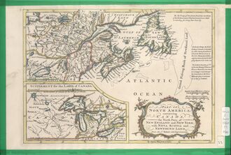 أمريكا الشمالية عام 1760، فور إبرام معاهدة پاريس. لاحظ أنه تم تصوير نيو إنگلاند في ذلك الوقت على أنها تقع على حدود نهر سانت لويس، أن مقاطعة نيويورك احتلت منطقة كندا العليا الجغرافية أو أونتاريو، وأن پنسلڤانيا احتلت معظم المنطقة الواقعة جنوب بحيرة إيري وأن نوڤا سكوشا لم يتم تقسيمها بعد من قبل نيو برونزويك.