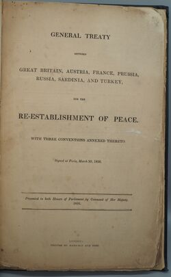 - ^ أ ب Hertslet, Edward (1875). "General treaty between Great Britain, Austria, France, Prussia, Russia, Sardinia and Turkey, signed at Paris on 30th March 1856". The Map of Europe by Treaty showing the various political and territorial changes which have taken place since the general peace of 1814, with numerous maps and notes. Vol. 2. London: Butterworth. pp. 1250–1265.