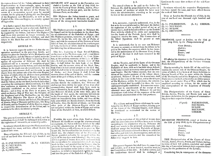 تم ابرام هذه المعاهدة بان وقع عليها كل من اللورد بالمرستون عن انجلترا، والبارون نومان السفير النمساوي في انجلترا عن النمسا، والبارون بيلوف عن بروسيا، والبارون برينوف عن الروسيا، وشكيب افندي وزير تركيا المفوض في لندره عن الباب العالي، وقد ابرمت المعاهدة بغير علم مصر وفرنسا، فقد فوجئت الحكومة الفرنسية بخبرها مفاجاة، فلما اذيع نبا ابراهما ادرك المسيو تييرس ما في هذا العمل من التحدي لفرنسا والغض منها، وكان من نتائجها ان هجات الخواطر فيها وتوتر العلاقات بينها وبين انجلترا، وكادت تقع الحرب، فارغت فرنسا وازبدت، واخذت تستعد وتحرض محمد علي باشا على نبذ قرارات الدول ، لكنها ادركت اخر الامر ان استعداداتها لا تغير من موقف الدول المؤتمرة، وانها لا قبل لها بان تخوض غمار حرب اوروبية، فتراجعت وتركت مصر وحدها امام الدول المؤتمرة، فاحتملت مصر نتائج سياسة فرنسا الخرقاء.