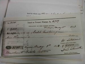 كلّف الرئيس الأمريكي جون تايلر كالب كوشنگ، النائب بالكونگرس عن مساتشوستس، بالسعي لتحقيق تكافؤ للتجار الأمريكان مع نظرائهم من الدول الأخرى. وهذا شيك بقيمة 9,000 دولار صادر من وزارة الخزانة الأمريكية لتغطية نفقات كوشنگ.