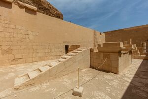 Outside the temple building proper was the temple enclosure, surrounded by a rectangular brick wall that symbolically protected the sacred space from outside disorder.[124] On occasion, this function was more than symbolic, especially during the last native dynasties in the fourth century BC, when the walls were fully fortified in case of invasion by the Achaemenid Empire.[125] In late temples, these walls frequently had alternating concave and convex courses of bricks, so that the top of the wall undulated vertically. This pattern may have been meant to evoke the mythological waters of chaos.[126]