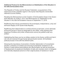 توصل الرئيسان الروسي ڤلاديمير پوتن والتركي رجب طيب أردوغان إلى بروتوكول إضافي لمذكرة إحلال الاستقرار في منطقة إدلب لخفض التوتر، الموقعة في 17 سبتمبر 2018. لوقف إطلاق النار في محافظة إدلب، يتضمن التالي: