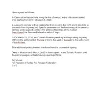 1- وقف كل الأعمال العسكرية على طول خط الاشتباك في منطقة إدلب لخفض التوتر من الساعة 00:01 في 6 مارس 2020.