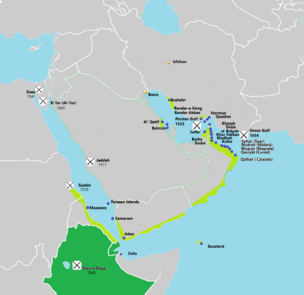 الپرتغاليون في الخليج العربي والبحر الأحمر. الأخضر الفاتح - الحيازات والمدن الرئيسية. الأخضر الداكن - حلفاء [ك‍?]مقالات قد تحوي أخطاء انتساخ أو داخل النفوذ. الأصفر- Main Factories.