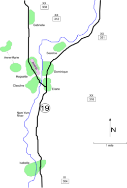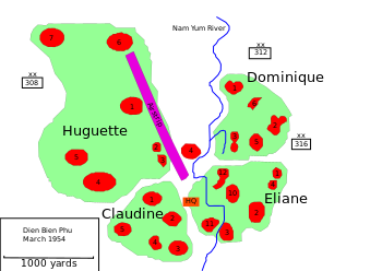 During the fighting at Eliane 1, on the other side of camp, the Viet Minh entrenchments had almost entirely surrounded Huguette 1 and 6. On 11 April the garrison of Huguette 1, supported by artillery from Claudine, launched an attack with the goal of resupplying Huguette 6 with water and ammunition. The attacks were repeated on the nights of the 14–15 and 16–17 April. While they did succeed in getting some supplies through, the French suffered heavy casualties, which convinced Langlais to abandon Huguette 6. Following a failed attempt to link up, on 18 April, the defenders at Huguette 6 made a daring break out, but only a few managed to make it to French lines.[22][23] The Viet Minh repeated the isolation and probing attacks against Huguette 1, and overran the fort on the morning of 22 April. After this key advance, the Viet Minh took control of more than 90 percent of the airfield, making accurate French parachute drops impossible.[24] This caused the landing zone to become perilously small, and effectively choked off much needed supplies.[25] A French attack against Huguette 1 later that day was repulsed.[26]