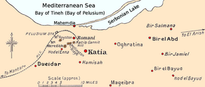 German General Friedrich Freiherr Kress von Kressenstein's raiding force retaliated to this growing British presence, by attacking the widely dispersed 5th Mounted Brigade on 23 April, Easter Sunday and also St George's Day, when Yeomanry were surprised and overwhelmed at Katia and Oghratina east of Romani. The mounted brigade had been sent to guard the water pipeline and railway as they were being extended beyond the protection of the Suez Canal defences into the desert towards Romani.[10][11][12]