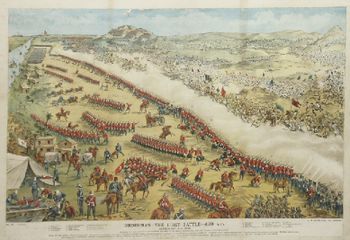 معركة أمدرمان، 1898، من متحف پرتون، إنگلترة. هذا الرسم يصور البريطانيين يرتدون زي المراسم الأحمر ليميز الأفواج المشاركة. الأفواج في الصورة لهم أرقام مطبوعة معهم ومفتاح أسفل الرسم لتعريفهم. الزي الأحمر كان قد حل محله الكاكي منذ 1848 في الهند.