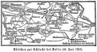 وجد فردريك حصار پراگ عسيراً، لأن المارشال ليوپولد فون داون، أكفأ القواد النمساويين، كان قادماً من مورافيا على رأس 64.000 مقاتل آخرين. فسار فردريك شرقاً يقود 32.000 مقاتل بعد أن ترك جزءاً من جيشه ليحاصر القلعة، والتقى بالجحافل الزاحفة عند كولين Kolín ‏(16 يونيو)، وكانت ميزة العدو عليه كبيرة جداً وبراعة داون الحربية في هذه الحالة تفوق براعته. وعصى اثنان من قواد فردريك أوامره فأحدثوا خللاً في الجيش، وفقد فردريك أعصابه وصاح بفرسانه: