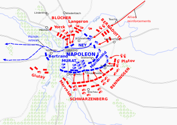 اتخذ نابليون موقعاً مكشوفاً في مؤخرة قواته وراح يُوجّه تحركاتها طوال ثلاثة أيام من العمليات (16-19 أكتوبر 1813)، على وفق ما قاله(15) (أي نابليون) فقد ظلَّ للفرنسيين اليد العليا حتى 18 أكتوبر وعندها تحوّل الجنود السكسون Saxon troops إلى القوات المتحالفة ضد نابليون ووجهوا مدافعهم ضدّ الفرنسيين الذين اعترتهم الدهشة وغمرتهم الفوضى فبدأوا يفقدون مواقعهم(61).