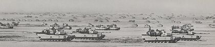 ![]() A dug-in Iraqi T-72 Asad Babil tank at the Battle of Norfolk, 26 February 1991 | |||||||