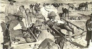 For these long-range desert operations, it was necessary for all supplies to be well-organised and suitably packaged for transportation on camels, moving with the column or following closely behind. It was vital that the soldiers were well trained for these conditions. If a man was left behind in the inhospitable Sinai, he might die in the burning desert sun during the day, or bitter cold at night. If a water bottle was accidentally tipped up or leaked, it could mean no water for its owner, for perhaps 24 hours in extreme temperatures.[16]