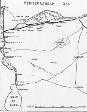 At the beginning of the First World War, the Egyptian police who had controlled the Sinai Desert were withdrawn, leaving the area largely unprotected. In February 1915, a German and Ottoman force unsuccessfully attacked the Suez Canal.[2] After the Gallipoli Campaign, a second joint German and Ottoman force again advanced across the desert to threaten the canal, during July 1916. This force was defeated in August at the Battle of Romani, after which the Anzac Mounted Division, also known as the A. & N. Z. Mounted Division, under the command of the Australian major general Harry Chauvel, pushed the Ottoman Army's Desert Force commanded by the German general Friedrich Freiherr Kress von Kressenstein out of Bir el Abd and across the Sinai to El Arish.[3][4]