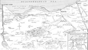 The Ottoman Army's Desert Force commanded by Kress von Kressenstein which operated in the Sinai region was sustained and supported by their principal desert base at عوجة الحفير, located on the Ottoman side of the Egyptian-Ottoman frontier. Hafir el Auja was linked to Beersheba, Gaza, and northern Palestine by road and railway.[3][9][10][Note 2][Note 3]