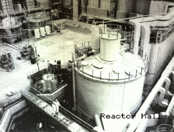Shevchenko BN350 nuclear fast reactor and desalination plant situated on the shore of the Caspian Sea. The plant generated 135 MWe and provided steam for an associated desalination plant. View of the interior of the reactor hall.