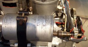 وفي نفس الوقت الذي يربط فيه المكبس البطارية بمحرك مفتاح التشغيل تحرك رافعة تحويل لتدفع قابض التجاوز إلى عمود الحركة في المحرك. ويحرك قابض التجاوز أسنان الترس الصغير ليتشابك مع أسنان الحذافة فيجعلها تدور بسرعة. وتدير الحذافة عمود الحركة المرفقي الذي يحرك المكبس ويشغل المُحرِّك وبذلك يبدأ تشغيل السيارة.