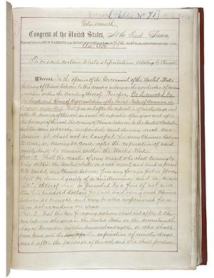 في أول تقييد بارز للهجرة الحرة في تاريخ الولايات المتحدة، أصدر الكونگرس قانون الإقصاء الصيني في 6 مايو 1882، بعد المراجعات التي أجريت عام 1880 لمعاهدة برلنگيم. سمحت هذه المراجعات للولايات المتحدة بتعليق الهجرة، وتصرف الكونگرس بسرعة لتطبيق تعليق الهجرة الصينية واستبعاد العمال الصينيين المهرة وغير المهرة من دخول البلاد لعشر سنوات، مع عقوبة السجن والترحيل. تم تجديد الحظر عدة مرات، واستمر لأكثر من 60 عاماً.