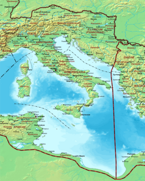 The praetorian prefecture of Italy (لاتينية: Praefectura praetorio Italiae, in its full form (until 356) praefectura praetorio Italiae, Illyrici et Africae) was one of four praetorian prefectures into which the Late Roman Empire was divided since the first half of the 4th century. It comprised the Italian peninsula, the western Balkans, the upper Danubian provinces and parts of North Africa. The Prefecture's seat moved from Rome to Milan and finally, Ravenna. It existed during the Later Roman Empire, and was part of the Western Roman Empire. The prefecture continued to function within Odoacer's and Ostrogothic kingdoms, and later within the Byzantine Empire, up to 584, when it was reorganized into the Exarchate of Ravenna.[1][2]
