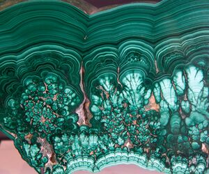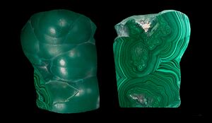 Malachite specimen, showing the original botryoidal form and a polished face of the opposite half of the specimen. Mines in the vicinity of Kolwezi supply much of the polishing-grade malachite in the world.