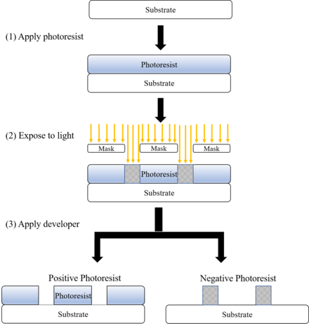 The process begins by coating a substrate with a light-sensitive organic material. A patterned mask is then applied to the surface to block light, so that only unmasked regions of the material will be exposed to light. A solvent, called a developer, is then applied to the surface. In the case of a positive photoresist, the photo-sensitive material is degraded by light and the developer will dissolve away the regions that were exposed to light, leaving behind a coating where the mask was placed. In the case of a negative photoresist, the photosensitive material is strengthened (either polymerized or cross-linked) by light, and the developer will dissolve away only the regions that were not exposed to light, leaving behind a coating in areas where the mask was not placed.