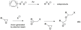 Photoresists can also be exposed by electron beams, producing the same results as exposure by light. The main difference is that while photons are absorbed, depositing all their energy at once, electrons deposit their energy gradually, and scatter within the photoresist during this process. As with high-energy wavelengths, many transitions are excited by electron beams, and heating and outgassing are still a concern. The dissociation energy for a C-C bond is 3.6 eV. Secondary electrons generated by primary ionizing radiation have energies sufficient to dissociate this bond, causing scission. In addition, the low-energy electrons have a longer photoresist interaction time due to their lower speed; essentially the electron has to be at rest with respect to the molecule in order to react most strongly via dissociative electron attachment, where the electron comes to rest at the molecule, depositing all its kinetic energy.[13] The resulting scission breaks the original polymer into segments of lower molecular weight, which are more readily dissolved in a solvent, or else releases other chemical species (acids) which catalyze further scission reactions (see the discussion on chemically amplified resists below). It is not common to select photoresists for electron-beam exposure. Electron beam lithography usually relies on resists dedicated specifically to electron-beam exposure.