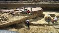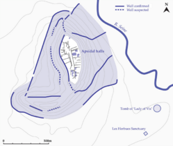 In 2006, a large complex with five large buildings was discovered at the centre of the site. The main building measured 35 by 22 m, with an estimated interior height of at least 15 m.[5][7] The large hall had an apse at the back and a front porch in antis. Overall, the central unit resembles the megaron complex of early Greek architecture. Such a find is unprecedented in early Celtic Europe. Finds suggested domestic use or feasting uses. The structure has been described as the "Palace" of the Lady of Vix (Palais de la Dame de Vix). According to Chaume (2011): "The interior space of about 500 m² is divided into three rooms of unequal size. This achievement demonstrates a mastery of geometry and carpentry capable of freeing up vast interior spaces".[8] Geomagnetic surveying has revealed another large apsidal building in a large walled area at the foot of Mont Lassois, on the other side of the river Seine. The building is of similar size and design to those on the Mont Lassois plateau and has also been described as a 'palatial' building.[7] All six large buildings have an identical east-west orientation with their main entrances facing towards the sunrise in the east. This configuration may have been chosen for symbolic rather than practical reasons.[7] Various authors have suggested that the Lady of Vix may have been a priestess as well as a 'queen'.[9][10]
