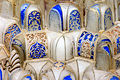 Muqarnas is typically applied to the undersides of domes, pendentives, cornices, squinches, arches and vaults and is often seen in the mihrab of a mosque.[7] They can be entirely ornamental, or serve as load-bearing structures. The earliest forms of muqarnas domes, found in the Mesopotamian region, were primarily structural. Muqarnas grew increasingly common and decorative in the beginning of the 12th century. Muqarnas can either be carved into the structural blocks of corbelled vaulting or hung from a structural roof as a purely decorative surface.[8][9] The most distinctive form of the muqarnas is the honeycomb structure, often intricate and impossibly fractal-like in its complexity. The individual cells are called alveoles.[10]