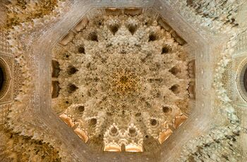 Muqarnas eventually reached its highest level of sophistication in the Alhambra of Granada, built by the Nasrids. The most impressive domes are found in the Palace of the Lions, built in the 14th century.[12] The dome over the chamber known today as the Sala de Dos Hermanas ('Hall of the Two Sisters') is one of the most magnificent muqarnas domes in Islamic art, consisting of at least 5000 alveoles that unfold from a central summit downward into sixteen miniature domes around the dome's perimeter.[31][32]