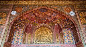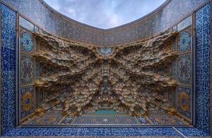 In Safavid Iran of the 16th to early 18th centuries, muqarnas was no longer used to cover the interiors of religious buildings but was still used to fill the vaults of iwans. Like other surfaces in Safavid architecture, they were typically covered in colourful tilework.[12] In the 18th century, Iranian muqarnas began to be covered with mirror glass mosaics, with one of the earliest examples found at Chehel Sotoun in Isfahan, dating to its restoration in 1706–7. This style was used afterward to decorate the interiors of major Shi'a shrines in Iran and Iraq.[12]