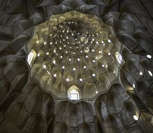 Some scholars have theorized that muqarnas originated in northeastern Iran, based on the evidence from Nishapur and Tim, and that it was further developed in subsequent Seljuk architecture, as seen in the Seljuk domes of the Great Mosque of Isfahan (1088).[13] Other scholars believe the most likely point of origin is instead Abbasid Iraq in the early 11th century, at a time when the Abbasids in Baghdad were undergoing a renaissance.[13][17][12] Alicia Carrillo Calderero has proposed that the first muqarnas originated in the palaces of the Abbasid caliphs in Baghdad.[15][18]