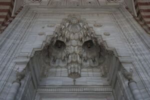 Under the Ottomans, the tradition of Seljuk muqarnas continued into Ottoman architecture, although it diminished in importance during the Classical period in the 16th century, when it was only one element in a wider decorative repertoire.[12] It was mainly used in entrance portals, niches, and column capitals.[17] It eventually faded from use in the 18th century, when European-influenced decoration began to predominate in the Ottoman Baroque period.[12]