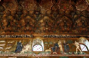Muqarnas was also used by Christian patrons outside the Muslim world, in regions influenced by Islamic art and culture. It is found in some monuments of Arab-Norman architecture in 12th-century Sicily. The most impressive example is in the Cappella Palatina (circa 1140) in Palermo, which has a central nave covered by the largest rectangular muqarnas vault in the world, made of painted wood.[22] The frequent use of muqarnas in al-Andalus also led to its use in Mudéjar architecture commissioned by Christian Spanish patrons.[12] Armenian architecture in the 13th century also made use of muqarnas, spurred by the influence of contemporary Islamic architecture.[37]