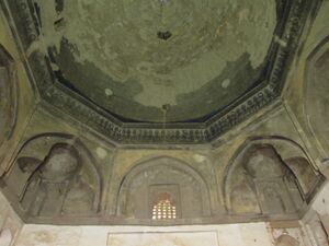 Muqarnas was also a recurring embellishment of vaults and iwans in Mughal architecture in the Indian subcontinent.[27] Experimentation with new styles of vaulting was characteristic of the reign of Jahangir (ح. 1605–1627).[28] Muqarnas with small lozenge-shaped alveoles were combined with a related type of geometrically-patterned vaulting, usually based on a star motif. The latter was probably derived from the influence of Safavid architecture.[28] In Mughal decoration, muqarnas are often covered with arabesque decoration, crafted with molded plaster and fitted to each of the alveoles.[27]